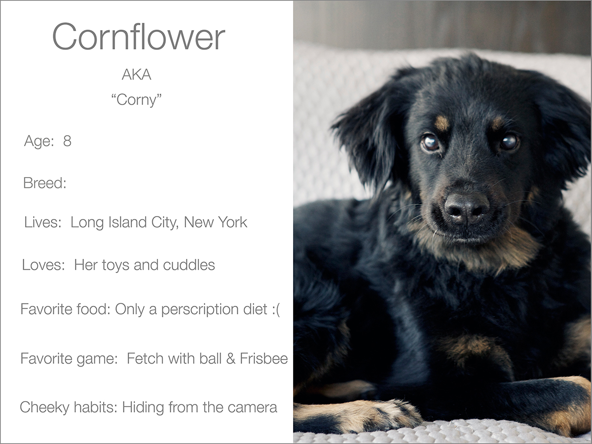 Cornflower can be shy, but she loves cuddling her humans and her cousin Peanut, she also loves the dog park and other dogs.