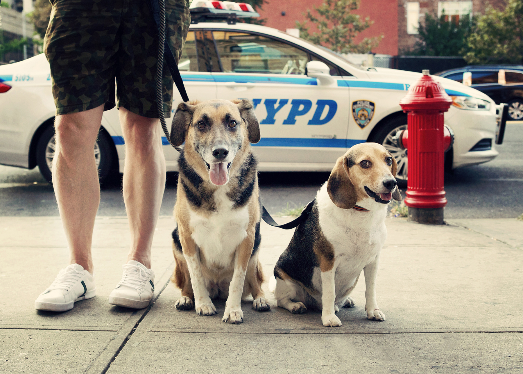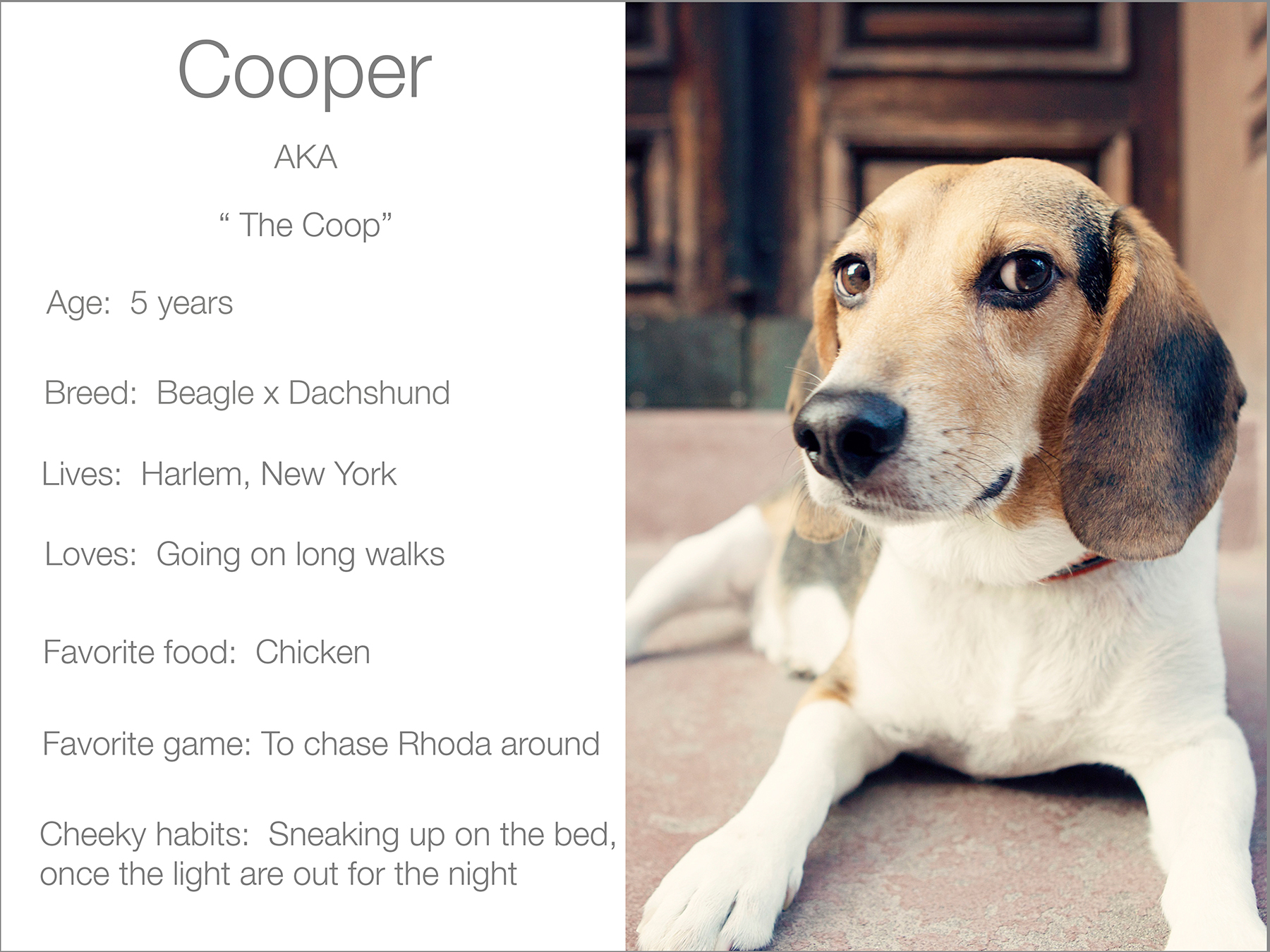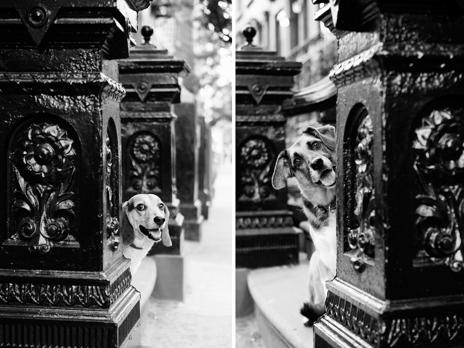 These two brown, black and white babies are true New York City Dogs. Rhoda was the first to adopt owners Chris & Bill. She was named after Rhoda Morgenstern, in the 70’s TV show, set in NY. Then Cooper was being fostered in the same building a few years later. When one day they all met in the elevator and it was love at first site. Cooper is the typical cheeky little brother, he will start nibbling on Rhoda’s ear to get her to play with him. He also loves to play competitive catch with her and will usually go for the steal. The highlight of the week is doggie nights on the roof in their uptown Harlem building. They get to play with all the other cool New York City pups, while their dads drink wine. These two also have some funny sleeping habits. While Cooper is known for his sneaky, stealth moves to get into the bed at night.Β He also likes to take naps on the couch, spread out on his back with his lips parted ever so slightly making him look like a little gremlin. Rhoda loves to stretch out against the wall making herself look like “Superdog.” She also loves to hang out on the bed and “hold court” when no one is home. She likes to serve as the canine mayor of Harlem and keeps watch over the neighborhood by looking out the French doors of the apartment. How do we know what they get up to when no one is home, you may ask?