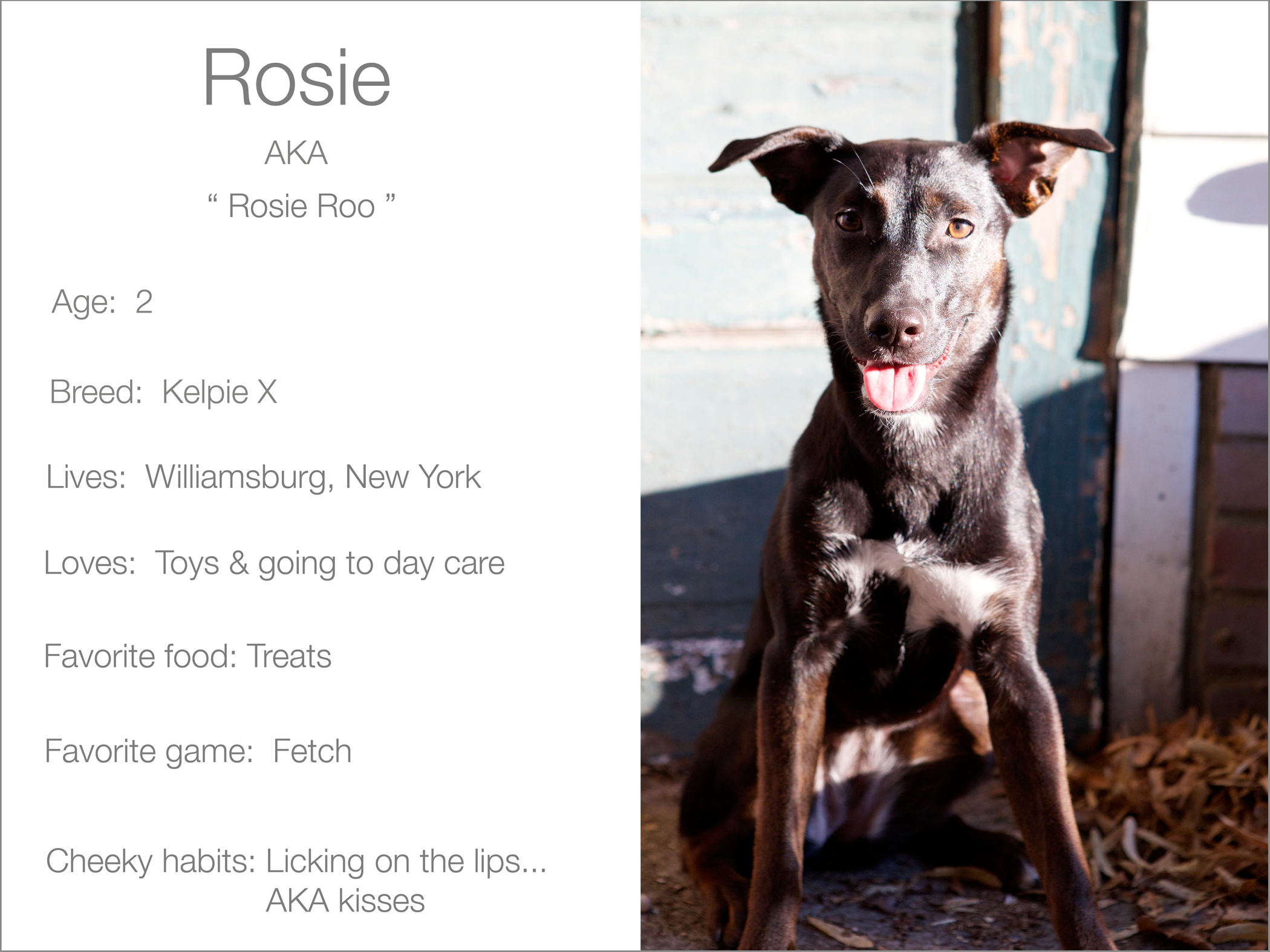 Miss Rosie, lives with her Mom & Dad in Williamsburg, Brookyln, New York. She also spends a few days a week at doggie daycare with her other furry friends. We actually saw one of her friends from daycare, on the street doing this shoot. They got very excited and we ended up having to move in a different direction. Rosie is a typical city dog, though she is actually moving to California in a few weeks, so I’m sure she be much happier being a West Coast girl.